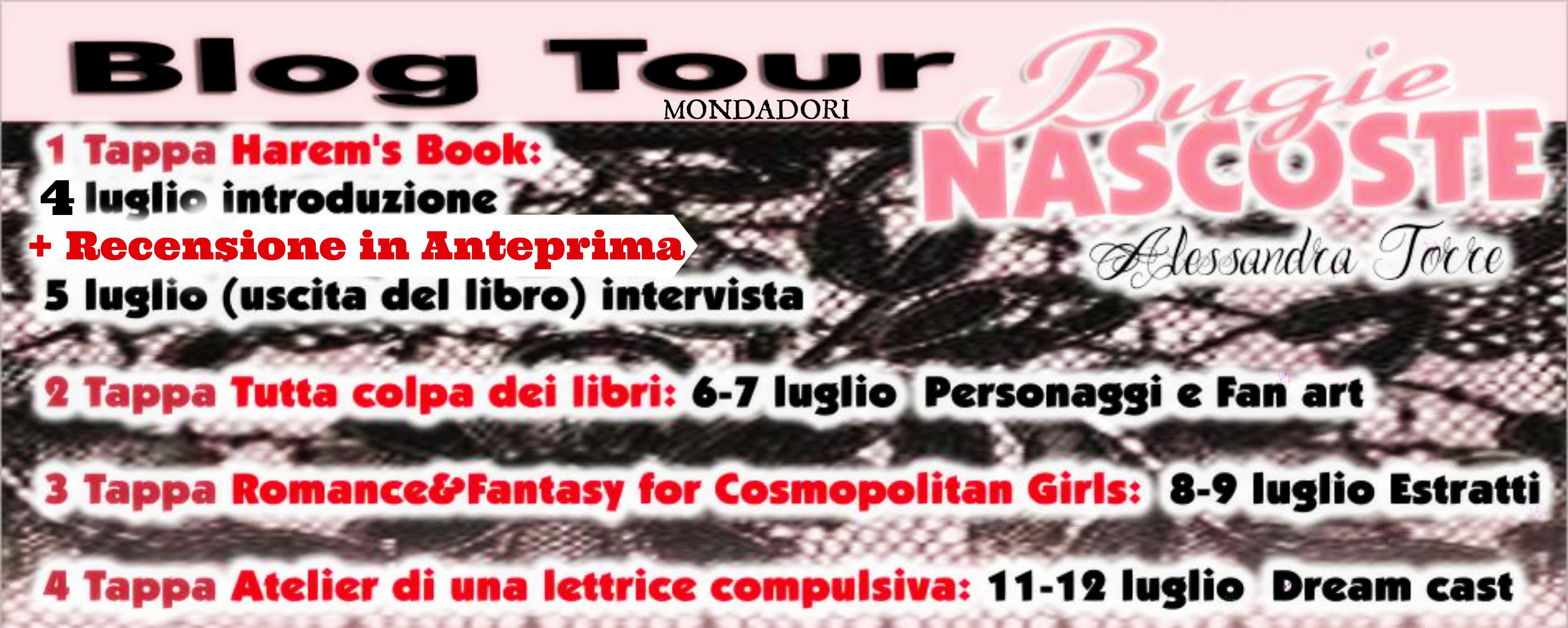 Buongiorno Amici dell’Harem,oggi abbiamo l’onore di ospitare la PRIMA TAPPA del Blog Tour dedicato al nuovo romanzo di Alessandra Torre:BUGIE NASCOSTE, che i lettori italiani potranno leggere a partire dal 5 luglio grazie alla casa editrice Mondadori.Si tratta di un erotic thriller autoconclusivo, ipnotico e allucinatorio, dall’intreccio complesso e ricco di colpi di scena. Una storia d’amore , bugie e tradimenti,complessa e articolata,ricca di personaggi e dall’intreccio intricato e avvincente in cui si mescolano alla perfezione suspense,erotismo ed emozioni.La prima tappa è articolata in due giorni:oggi vi presenterò in anteprima la mia recensione e domani 5 luglio,in occasione dell’uscita italiana del libro,potrete leggere l‘INTERVISTA ESCLUSIVA che l’autrice Alessandra Torre ha concesso al Blog Harem’s Book.Non mancate!